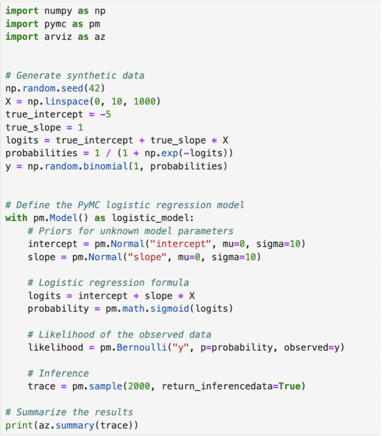 Let’s look at an example. We will see how to implement a simple logistic regression using the probabilistic programming package PyMC.